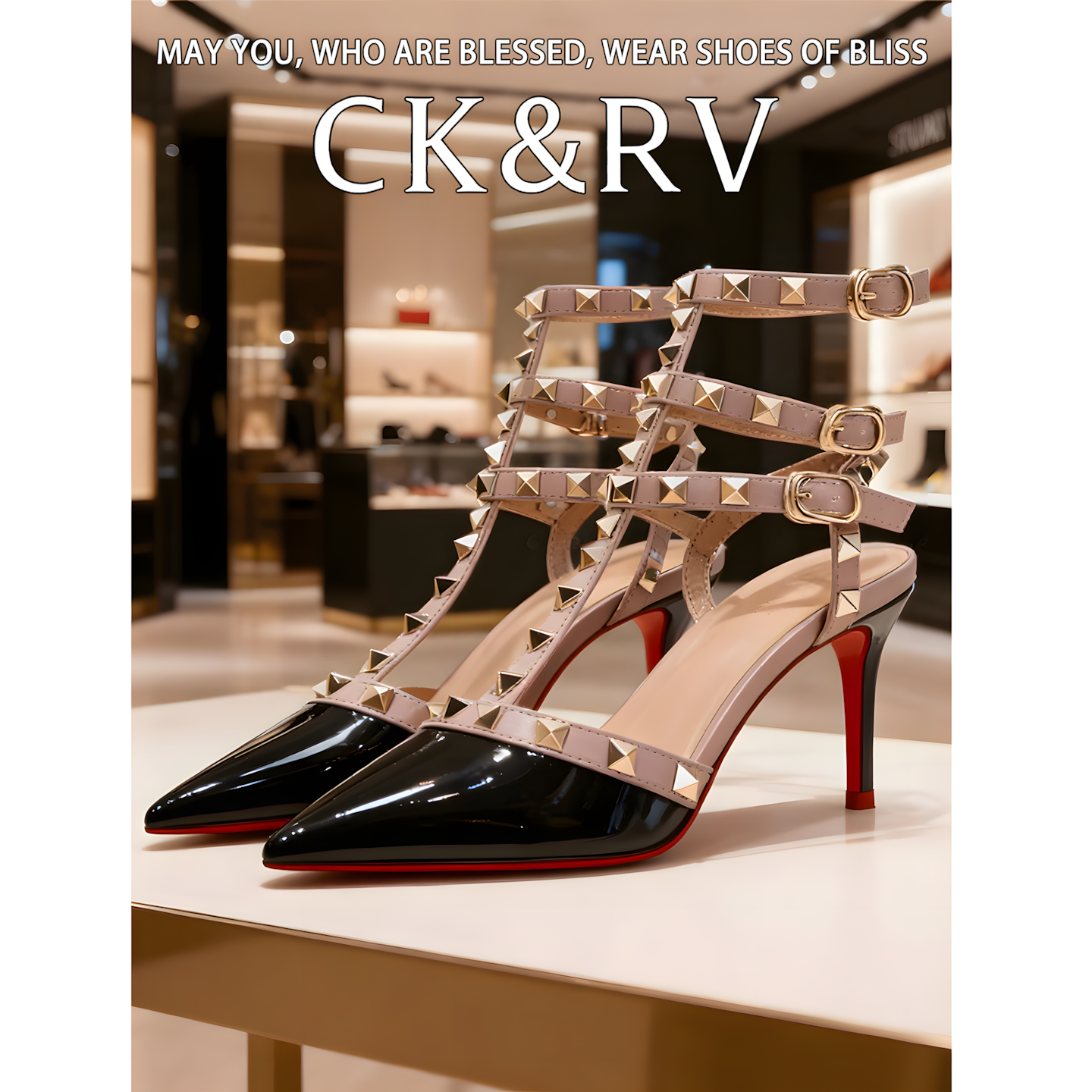 琮媛同款RV方扣钻裸色细跟中空高跟单鞋舒适百搭中跟气质性感女鞋