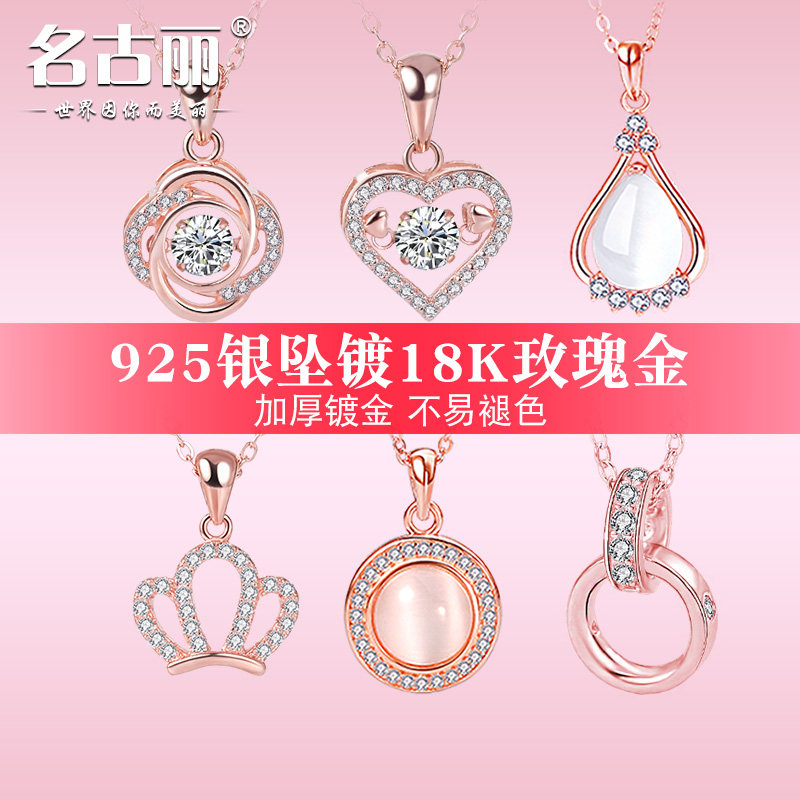 999纯银链子S925银饰镀玫瑰金吊坠女彩银项链18k金链子细锁骨素链