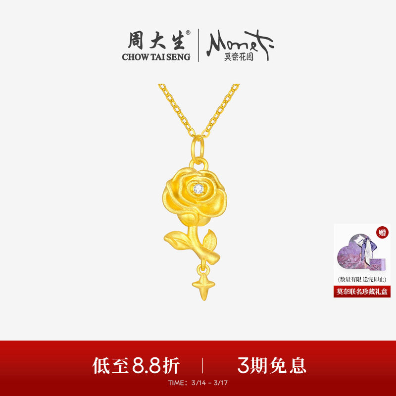 周大生黄18K金吊坠莫奈玫瑰星辰钻石项链锁骨链挂坠女生生日礼物