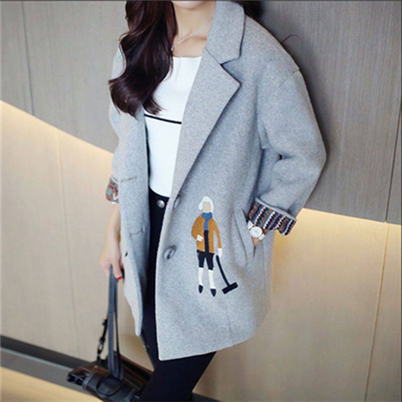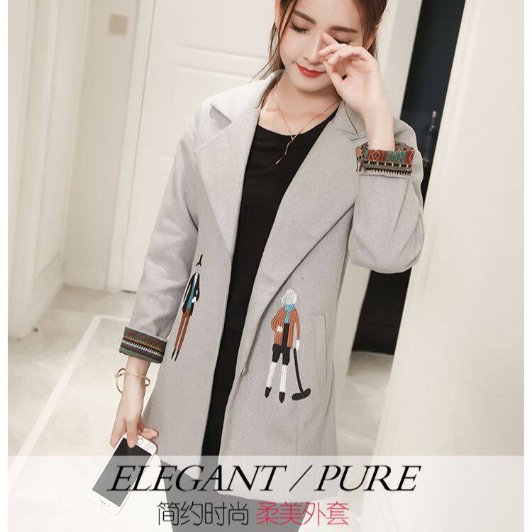 2022秋冬季新款韩版毛呢外套女中长款修身加厚宽松刺绣呢子大衣潮