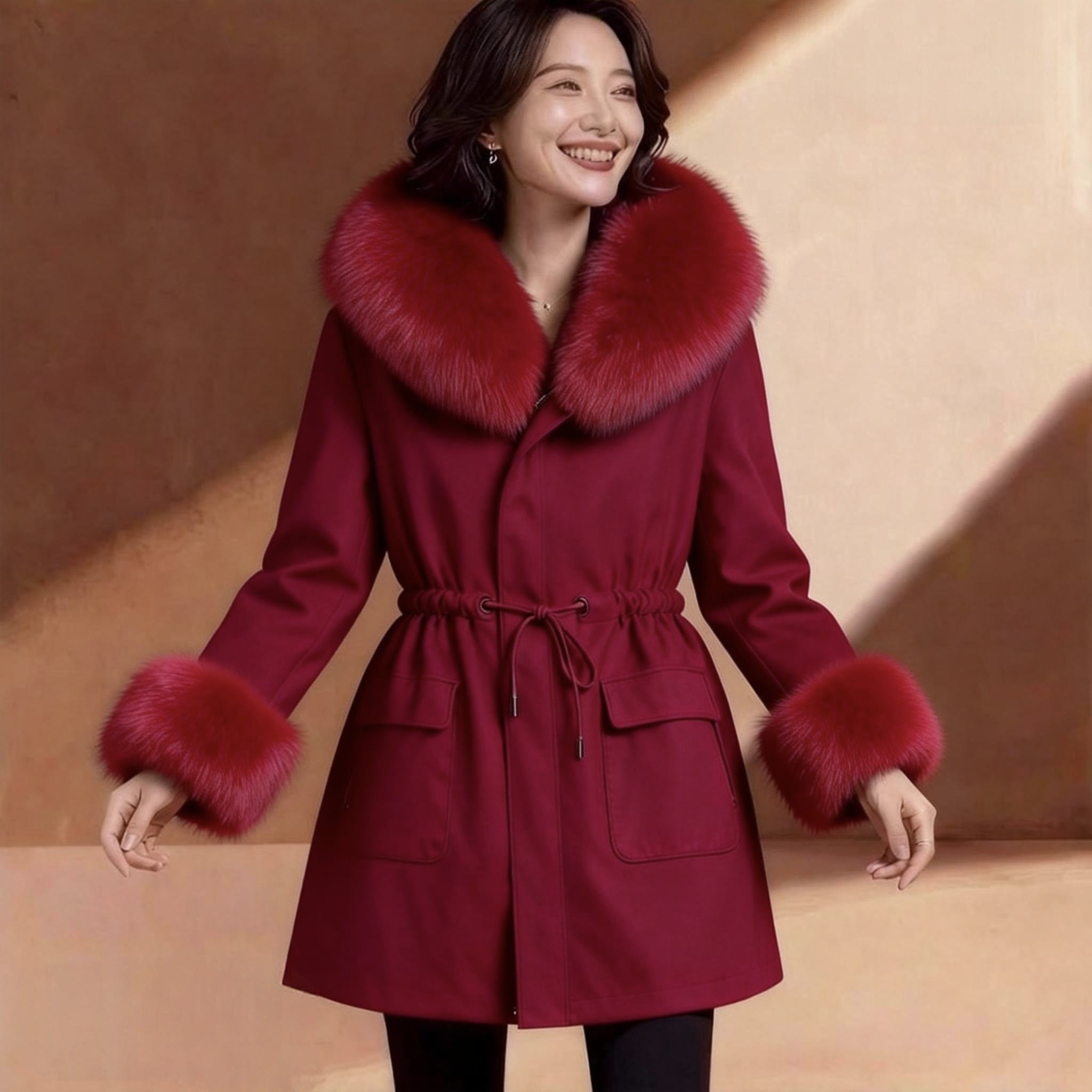 2026时尚奢华冬季皮草毛呢外套女中长款狐狸毛领加棉加厚保暖修身
