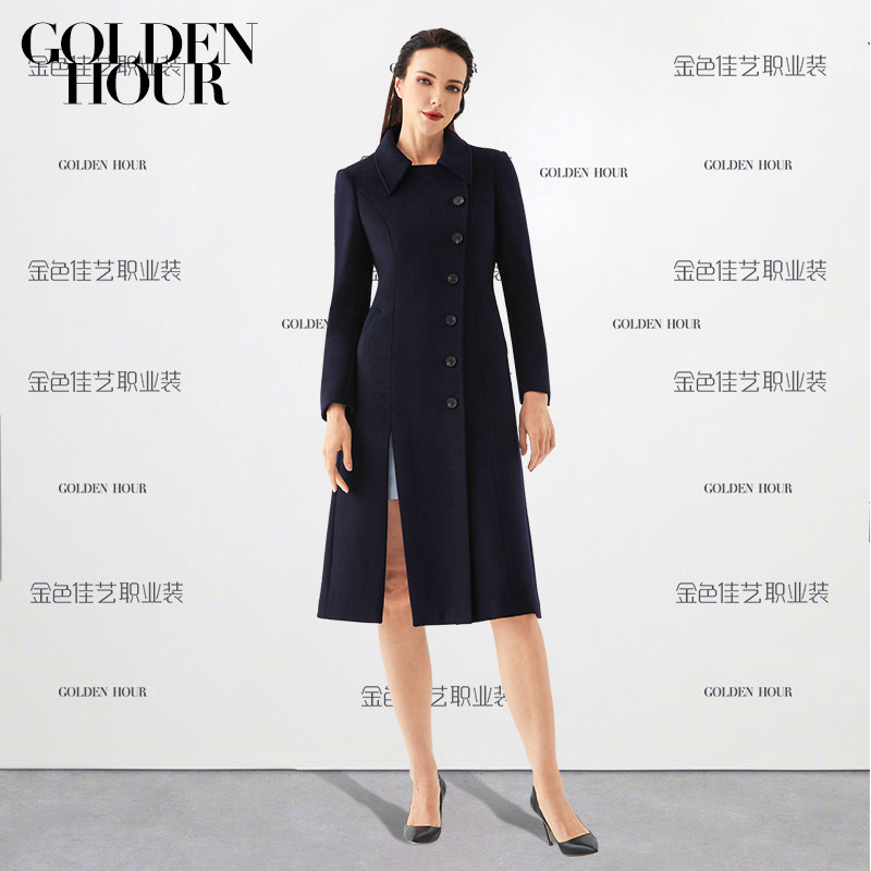 时尚秋冬季女士中长款加厚藏青羊毛大衣职业装修身毛呢外套工作服