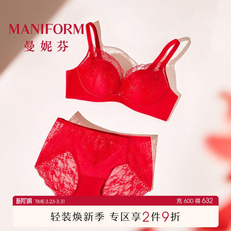 曼妮芬性感蕾丝小胸聚拢无钢圈文胸内衣女结婚本命年服红内裤套装