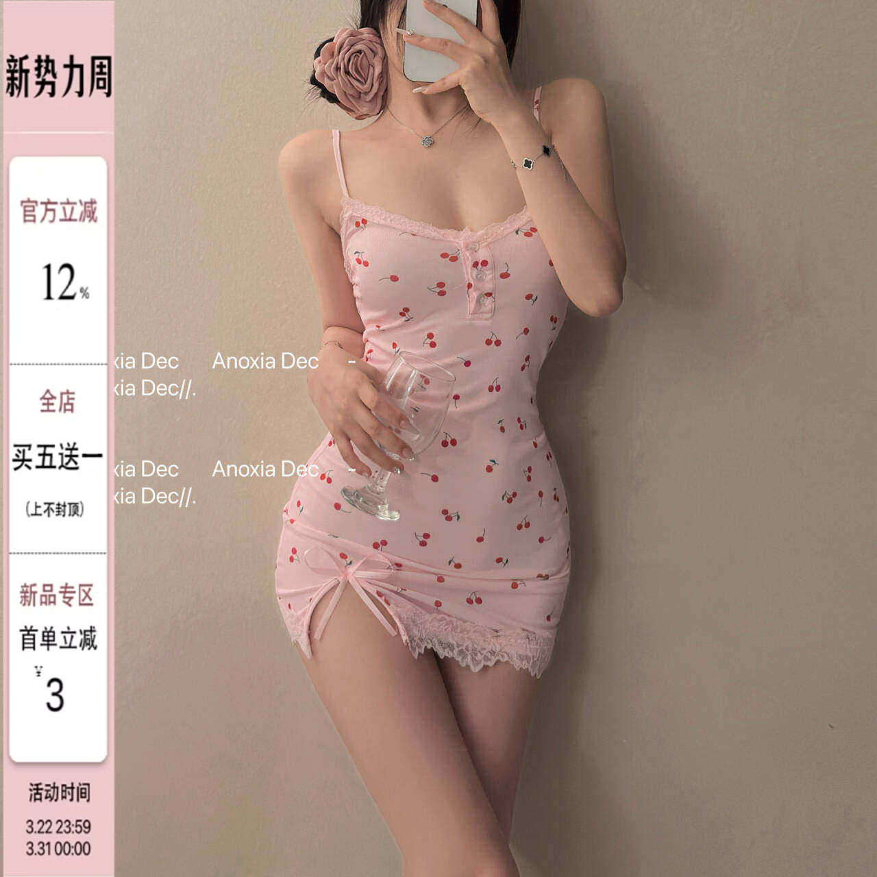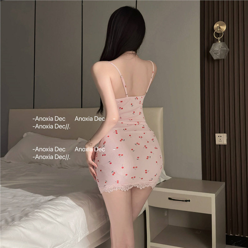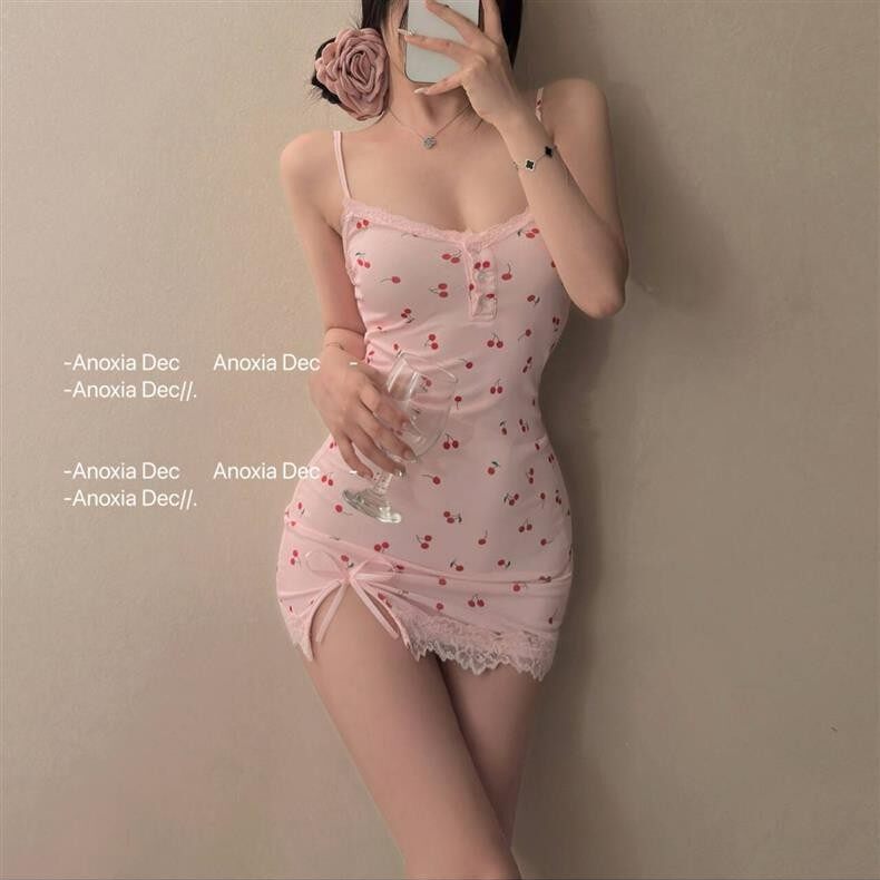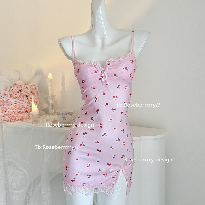 夏何夕樱桃印花纯欲风吊带睡裙低胸薄款蕾丝边带胸垫斩男性感睡衣