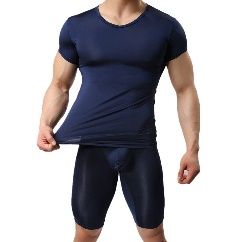 超弹丝滑薄款冰丝短袖中裤家居服2件套装睡衣男性感紧身打底内衣