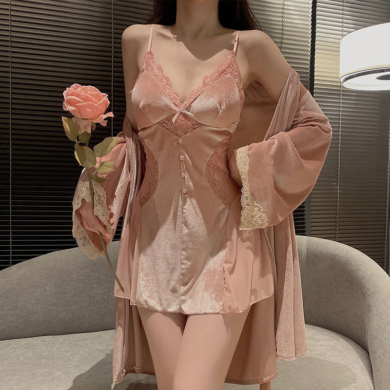 睡衣女2025新款法式金丝绒两件套高级感纯欲斩男性感蕾丝吊带睡袍