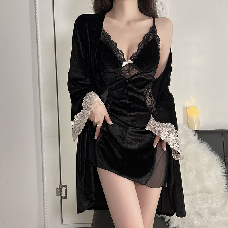 新款法式金丝绒睡衣女高级感纯欲斩男性感蕾丝吊裙睡袍黑色蝴蝶结