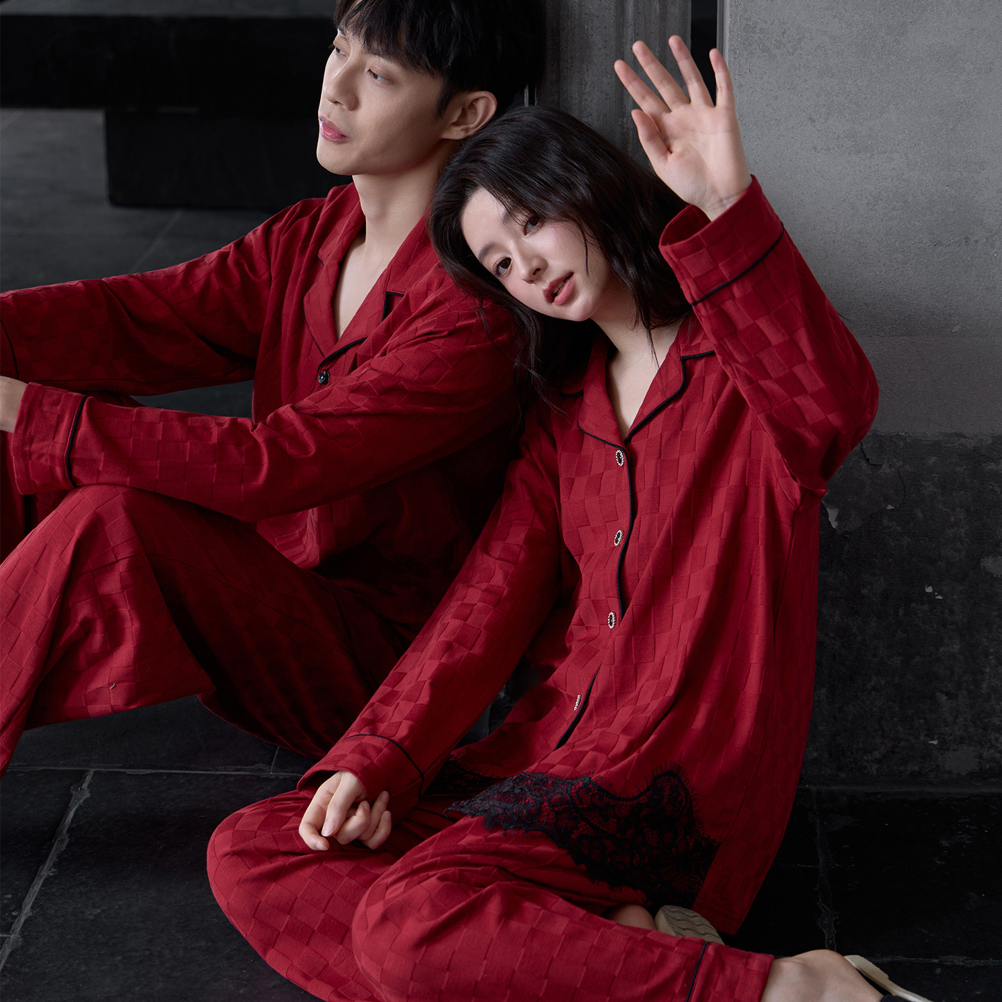 情侣睡衣春秋季纯棉长袖翻领男性感蕾丝边红色喜庆新娘家居服套装