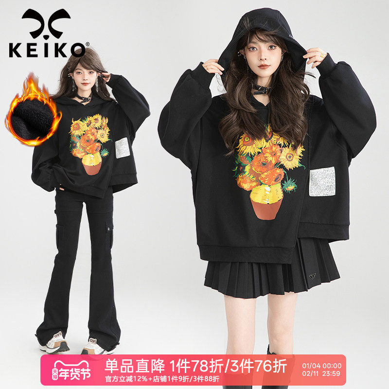 KEIKO 文艺复兴向日葵印花连帽卫衣女25秋冬高级感黑色宽松外套