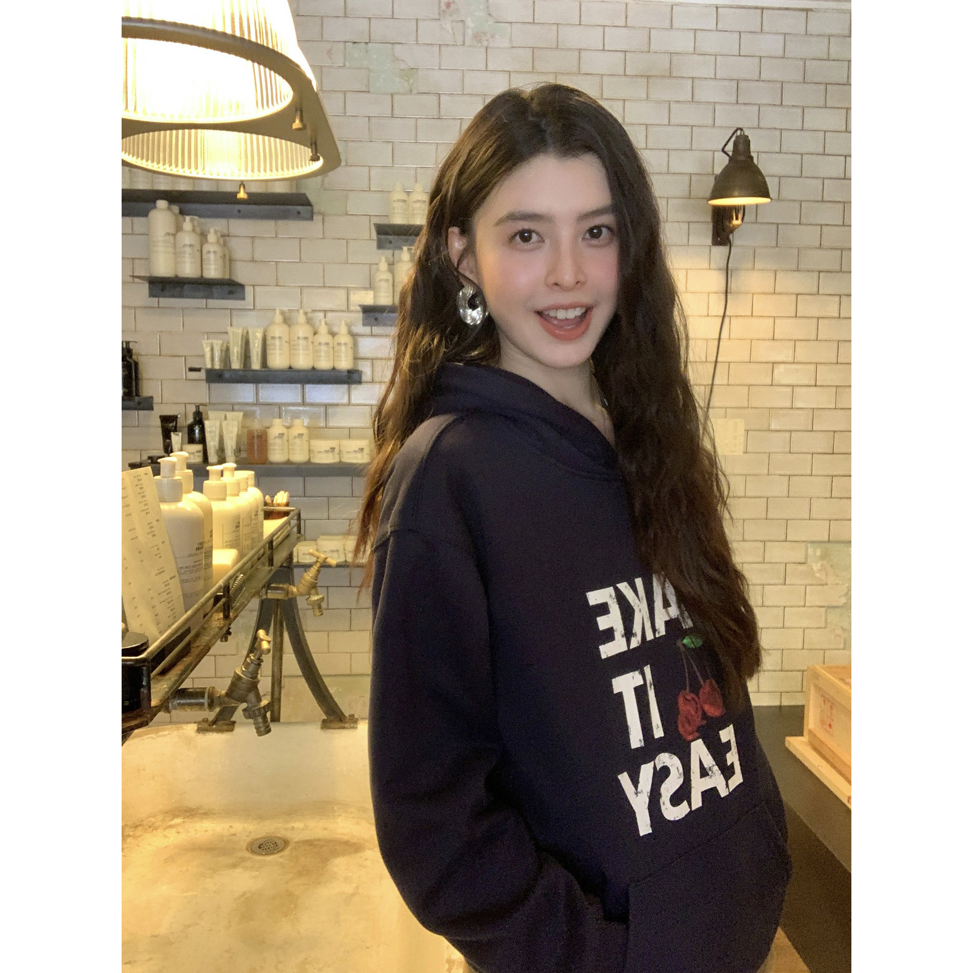 美式复古深蓝色印花连帽卫衣女秋冬季加绒加厚慵懒宽松情侣装外套