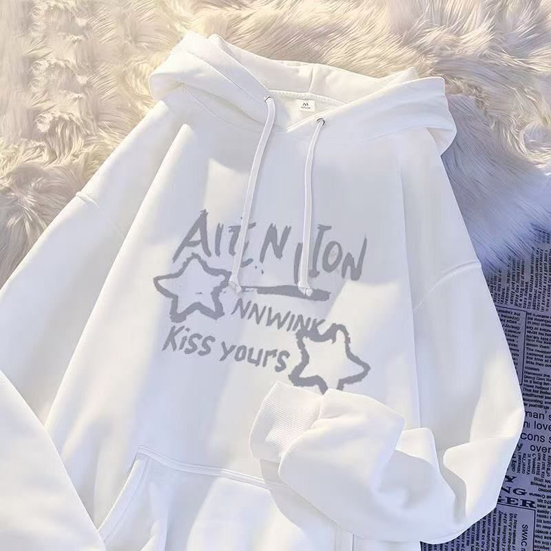 秋冬季新款加绒美式星星印花连帽卫衣女中大童上衣高街宽松慵懒风