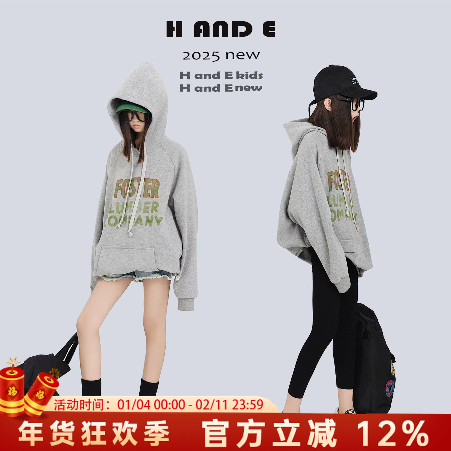 H AND E 原创童装2025秋季花灰色美式印花连帽卫衣女童亲子装母女