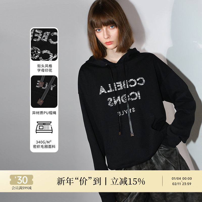COCOBELLA时尚字母印花连帽卫衣女秋气质PU抽绳休闲帽衫SE619