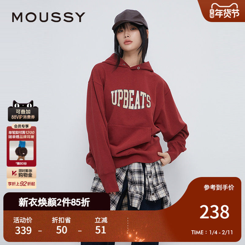 MOUSSY 冬季新品美式街头大LOGO印花连帽卫衣女028HAA90-2841