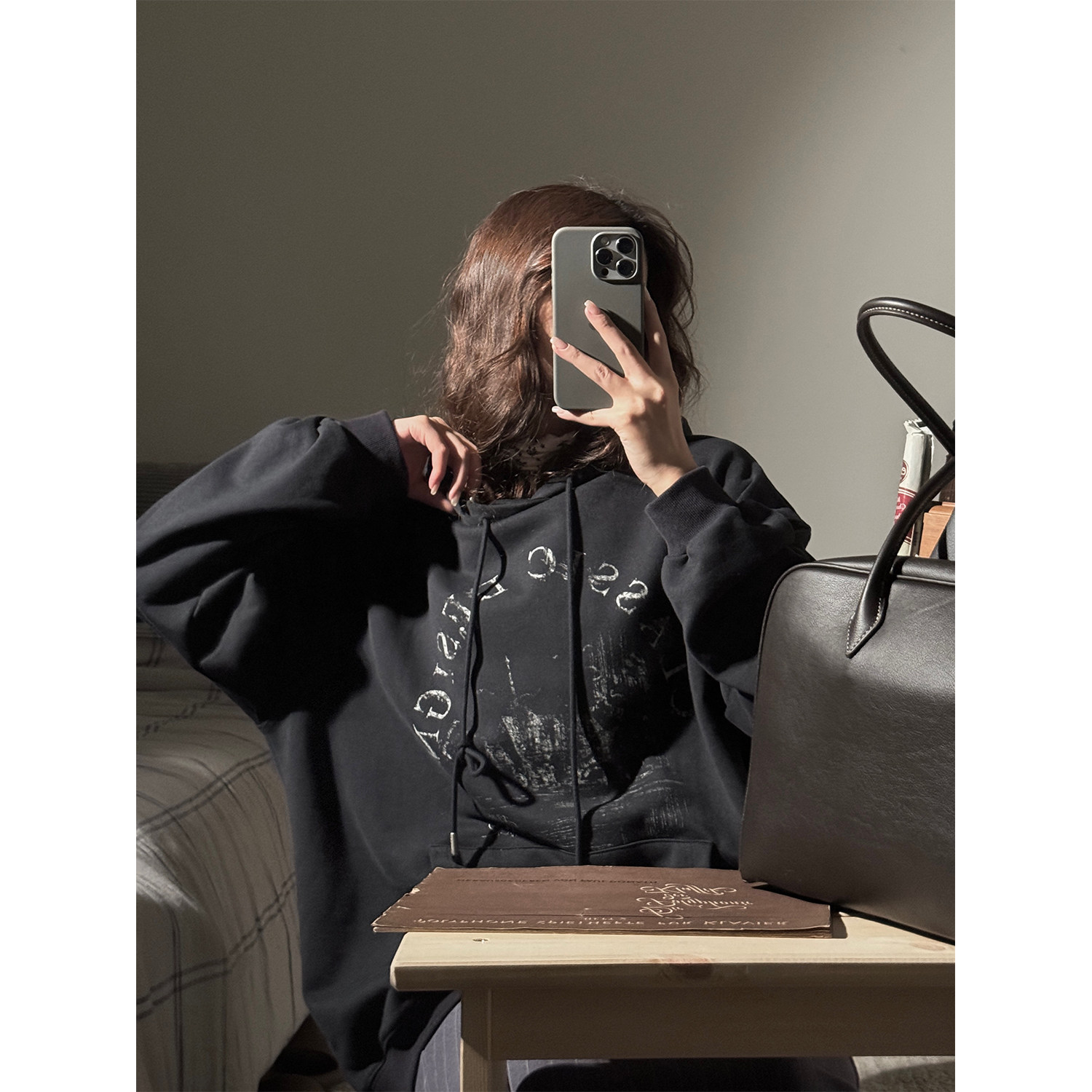 美式复古创意印花连帽卫衣女秋冬加绒加厚慵懒风oversize情侣外套