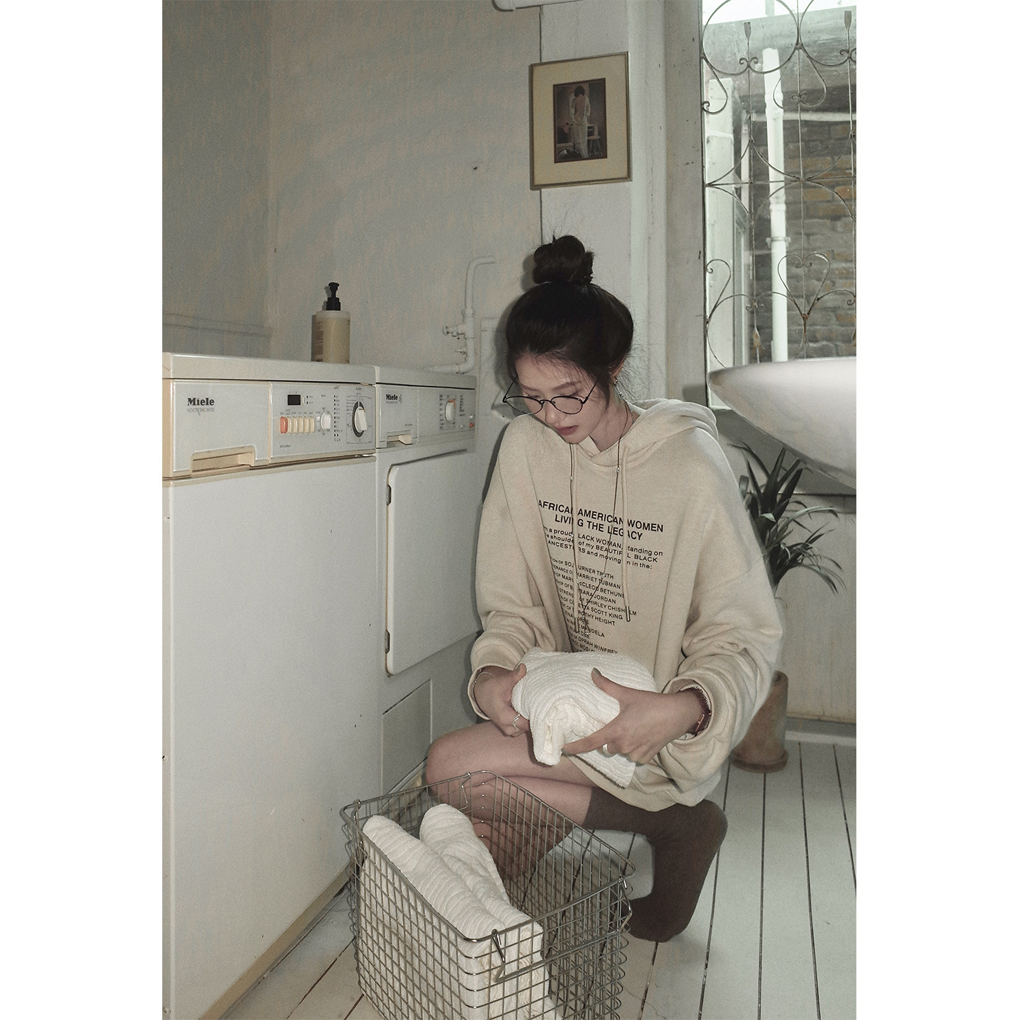 JMWOMEN亚麻色系 复古艺术字母印花连帽卫衣女秋季宽松慵懒感上衣