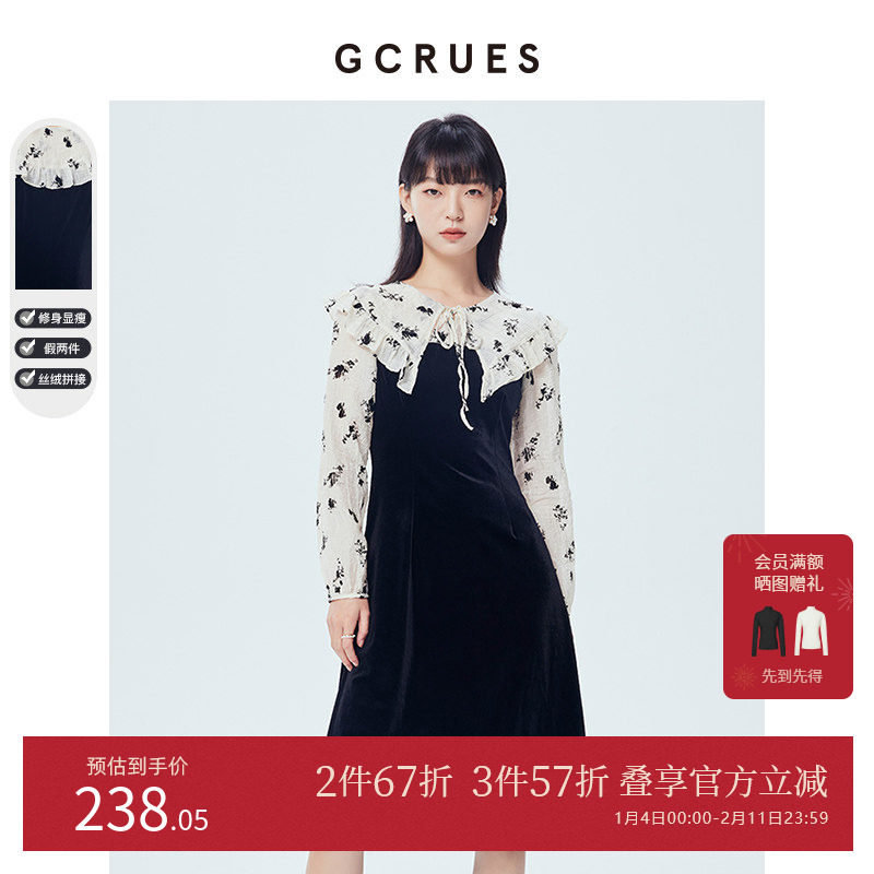 gcrues碎花拼接金丝绒假两件连衣裙女2025年秋季法式气质优雅裙子