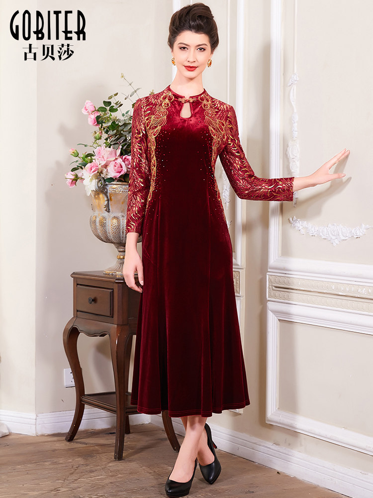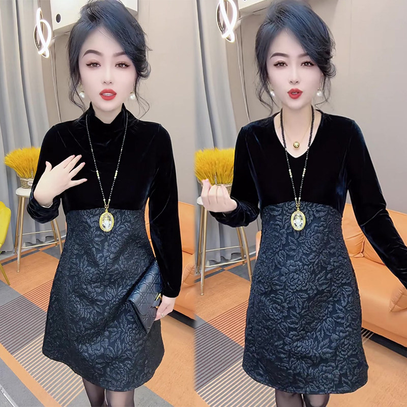 金丝绒拼接高端连衣裙秋冬妈妈装阔太太气质长款遮肉显瘦打底长裙