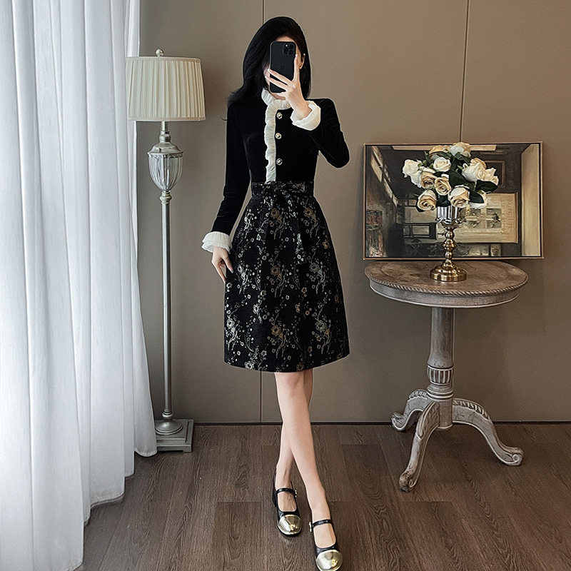 2025秋季新款金丝绒连衣裙女爆款时尚洋气显瘦压花拼接气质小黑裙