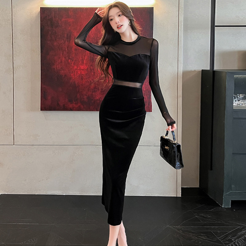 网纱拼接金丝绒长袖开叉性感小黑裙秋冬新款轻奢宴会礼服连衣裙女