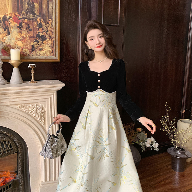 金丝绒拼接提花连衣裙女春季新款气质复古风高级感收腰假两件裙子