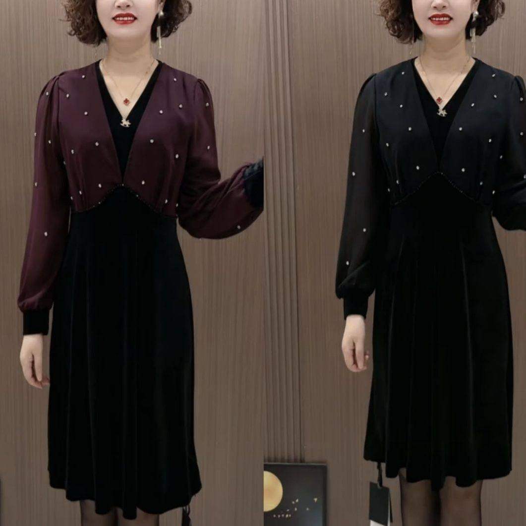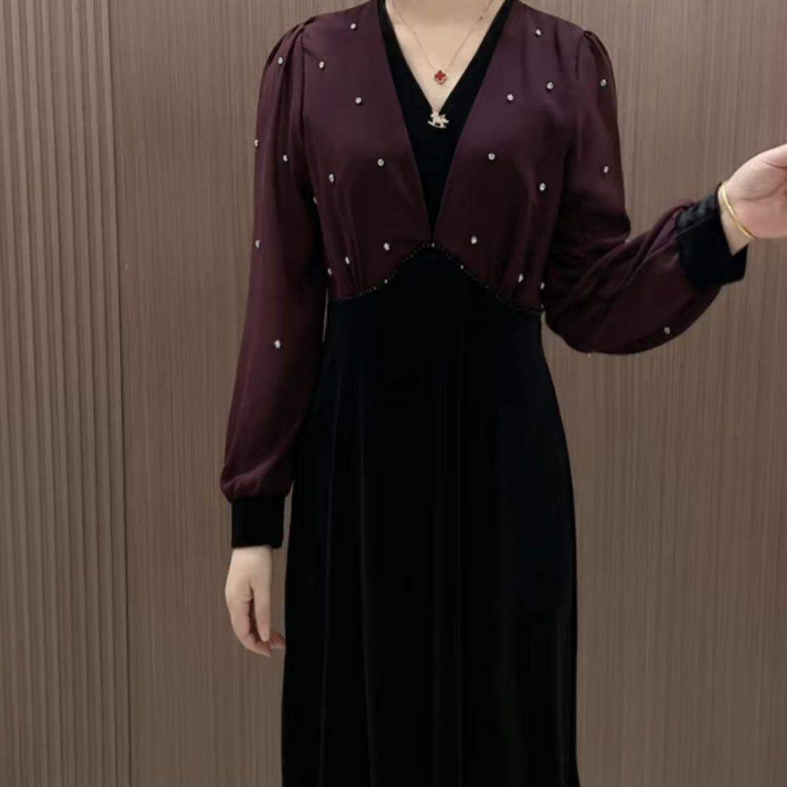 金丝绒连衣裙秋冬新款妈妈装高端拼接V领气质裙高贵洋气波点长裙