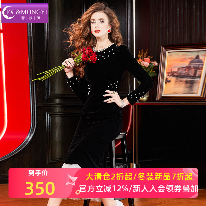 菲梦伊钉珠黑色金丝绒连衣裙女秋季法式独特设计感显瘦拼接网纱裙
