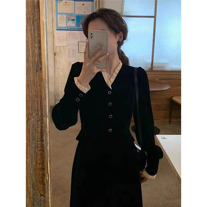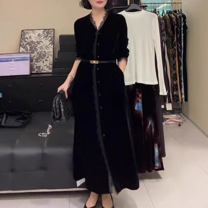金丝绒连衣裙秋冬季2025新款女黑色V领蕾丝拼接长袖气质显瘦裙子