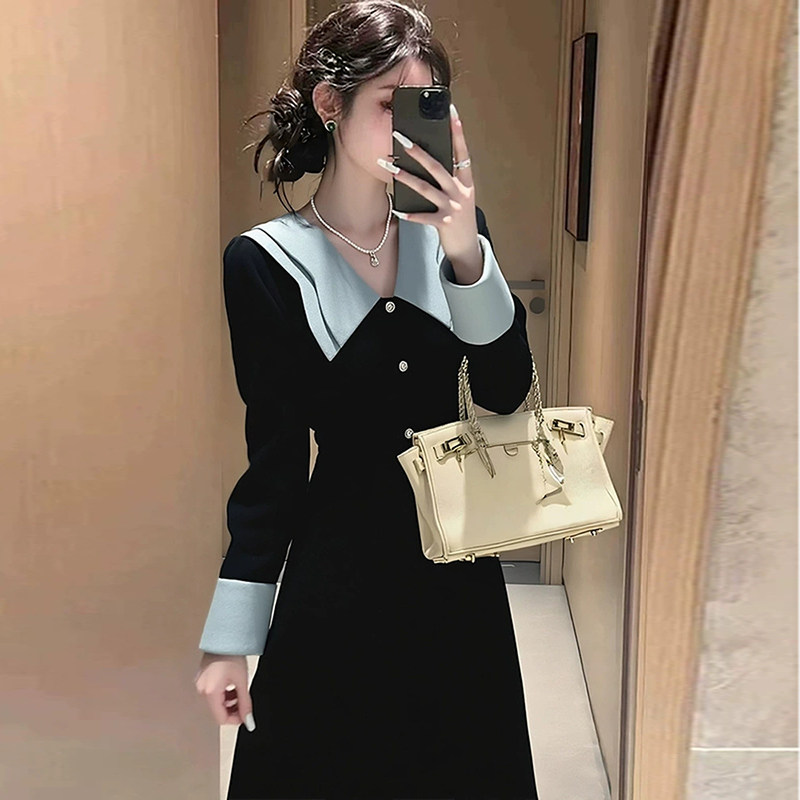 法式复古娃娃领拼接金丝绒连衣裙女秋冬高级感收腰显瘦过膝长裙子