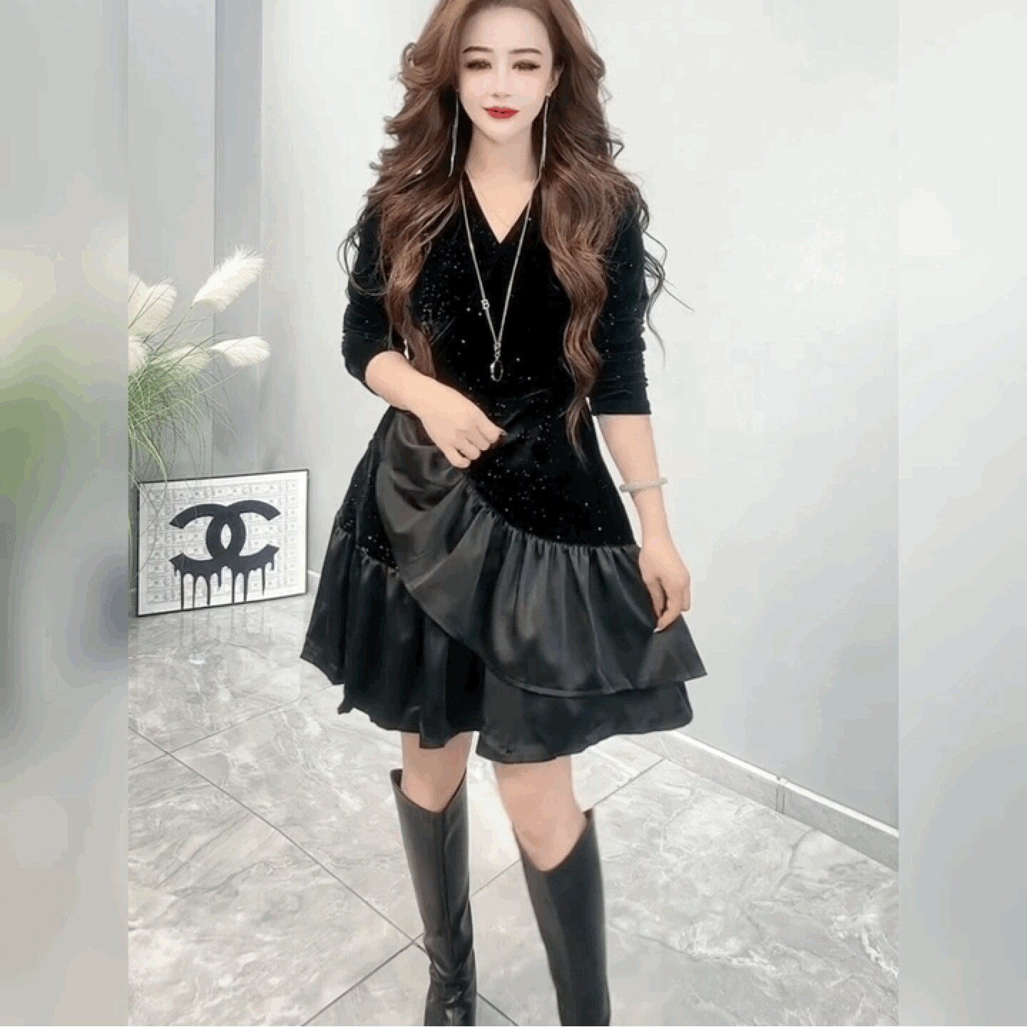 欧货金丝绒拼接连衣裙女洋气减龄显瘦v领设计感荷叶边长袖中长裙