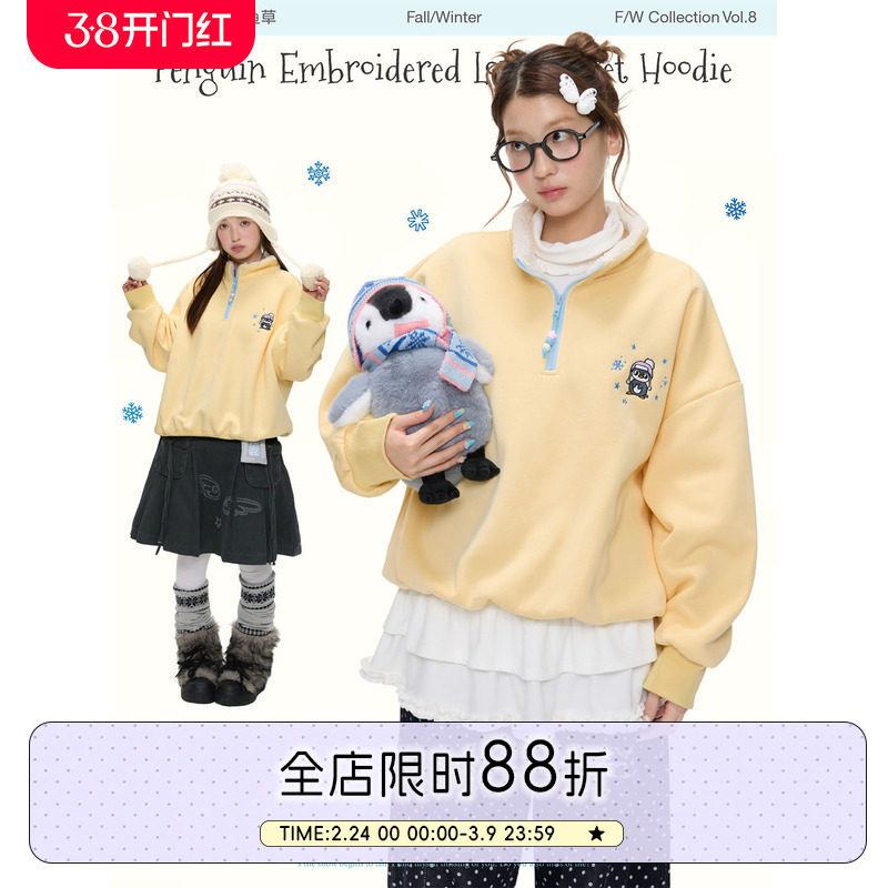 BETWEENAND「糖果企鹅」冬日奶黄色企鹅刺绣套头加绒加厚甜美卫衣