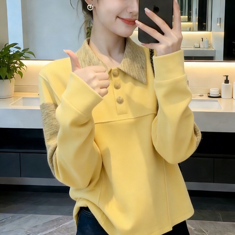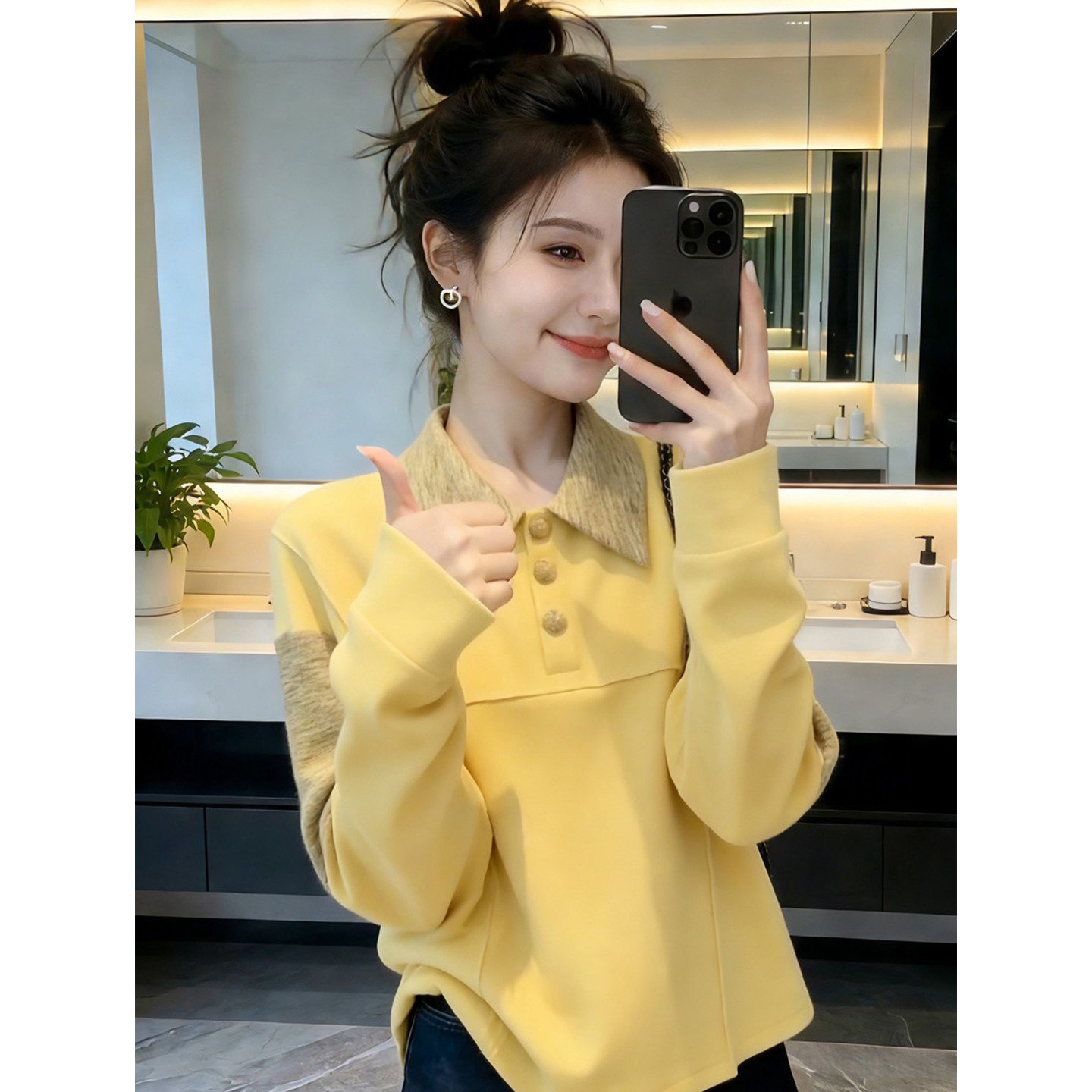 黄色拼接翻领套头宽松无帽卫衣女2026春季慵懒小个子超火减龄上衣