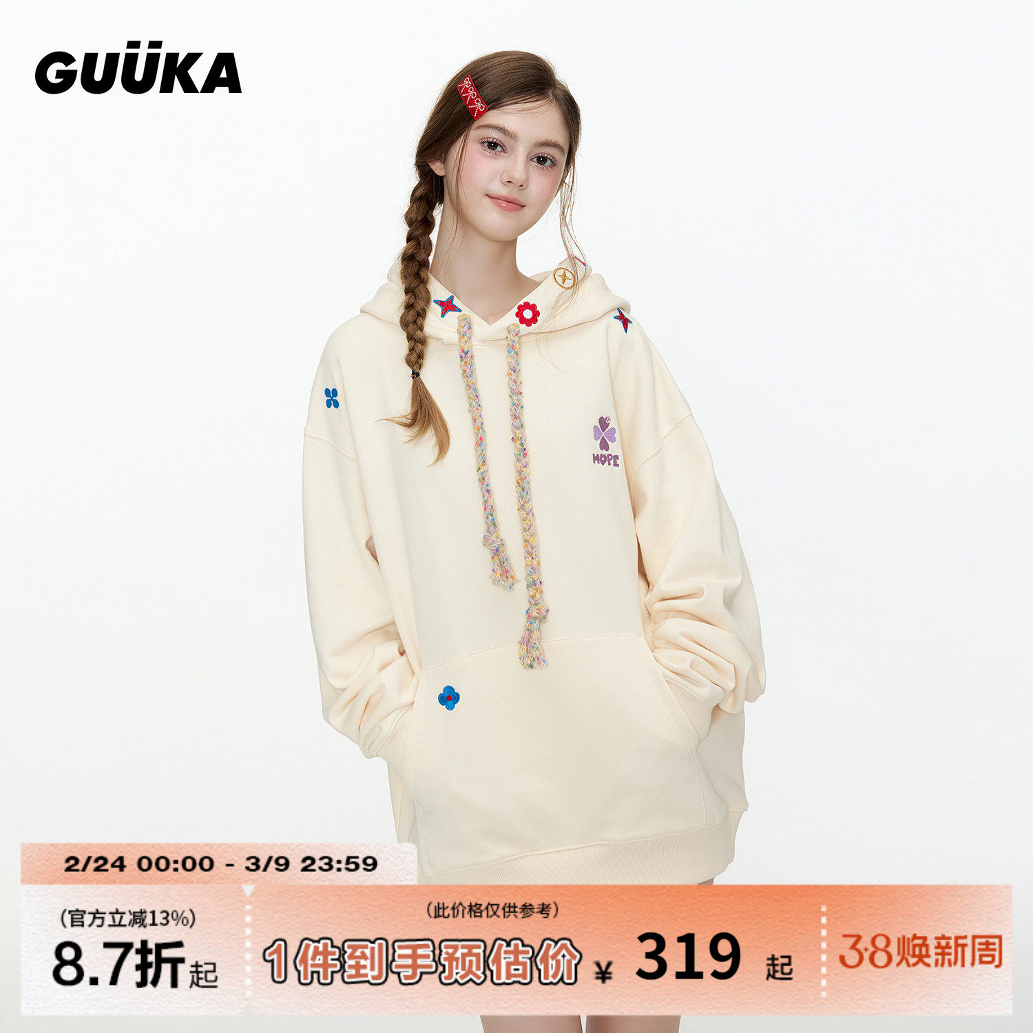 GUUKA奶黄色美式慵懒连帽卫衣女加绒 重磅纯棉彩色帽绳落肩套头衫
