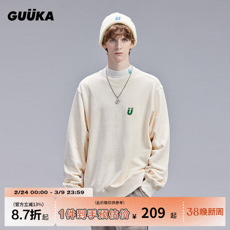 GUUKA奶黄色圆领卫衣男套头秋季潮牌 情侣嘻哈无帽刺绣上衣宽松