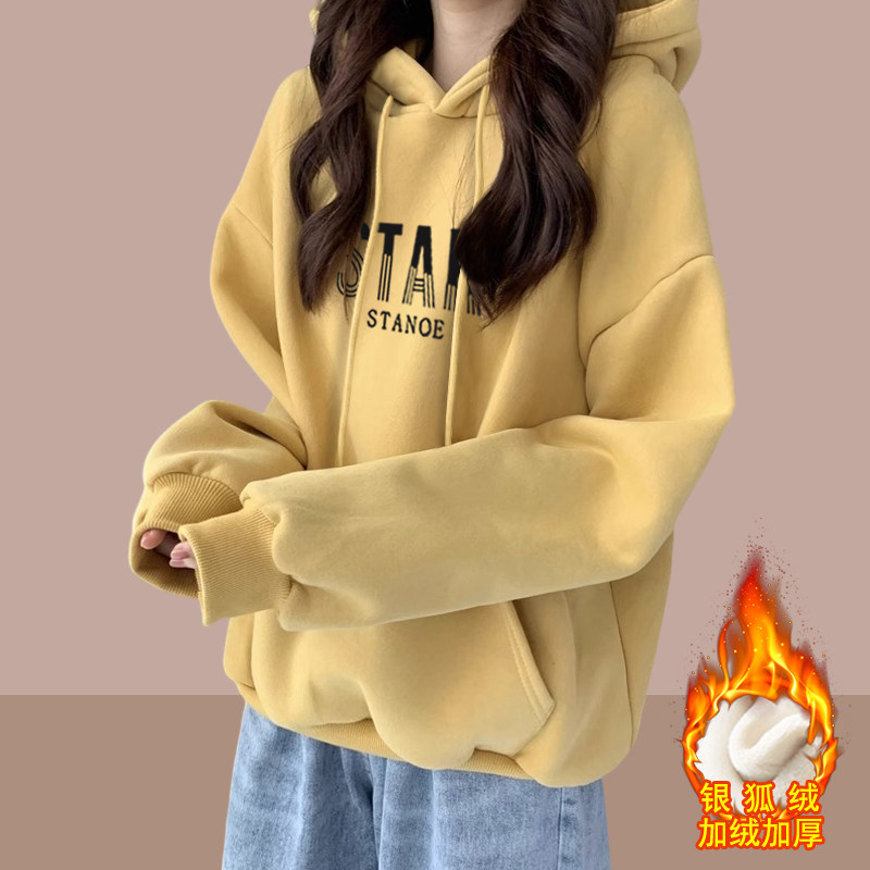 奶黄色连帽衫卫衣女秋冬韩版宽松中长款套头外套加绒加厚上衣ins
