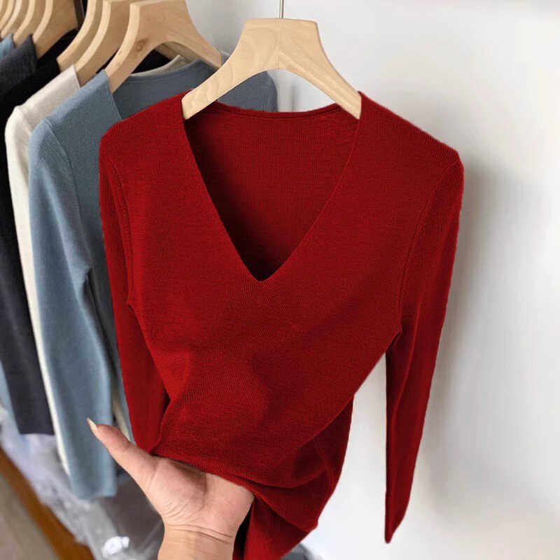 2025秋冬新款气质针织衫薄款百搭韩版V领长袖女性感修身打底上衣
