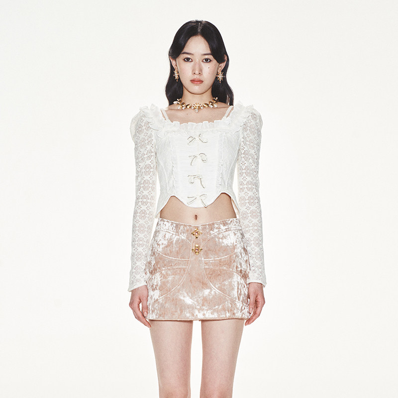 BBING甜饼 法式可爱少女性感优雅甜美花边修身显瘦泡泡袖衬衫上衣