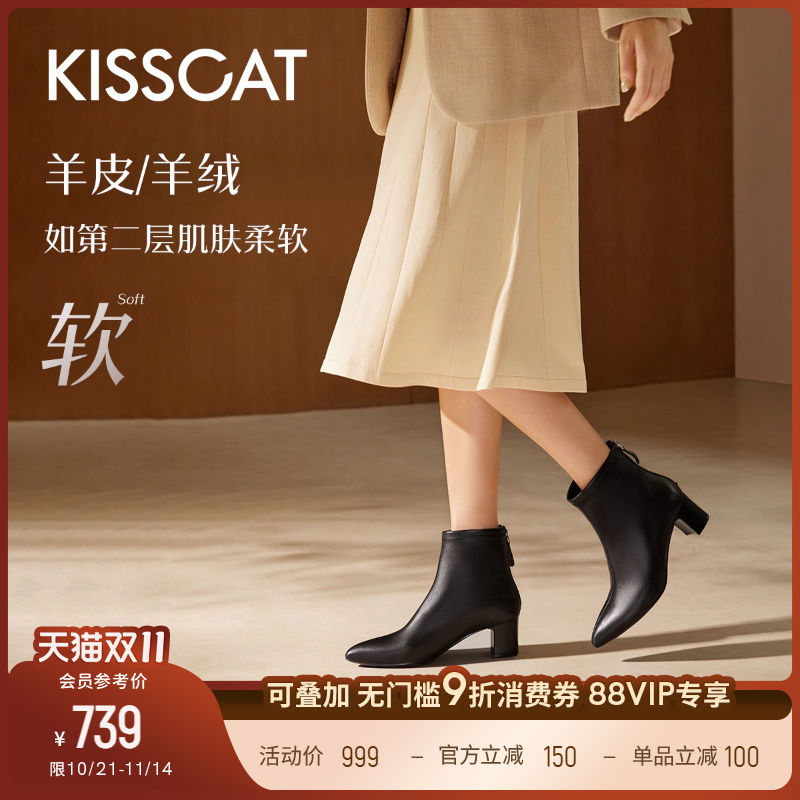 KISSCAT接吻猫[巴黎侧影]25冬尖头细跟真皮短靴法式时装靴瘦瘦靴