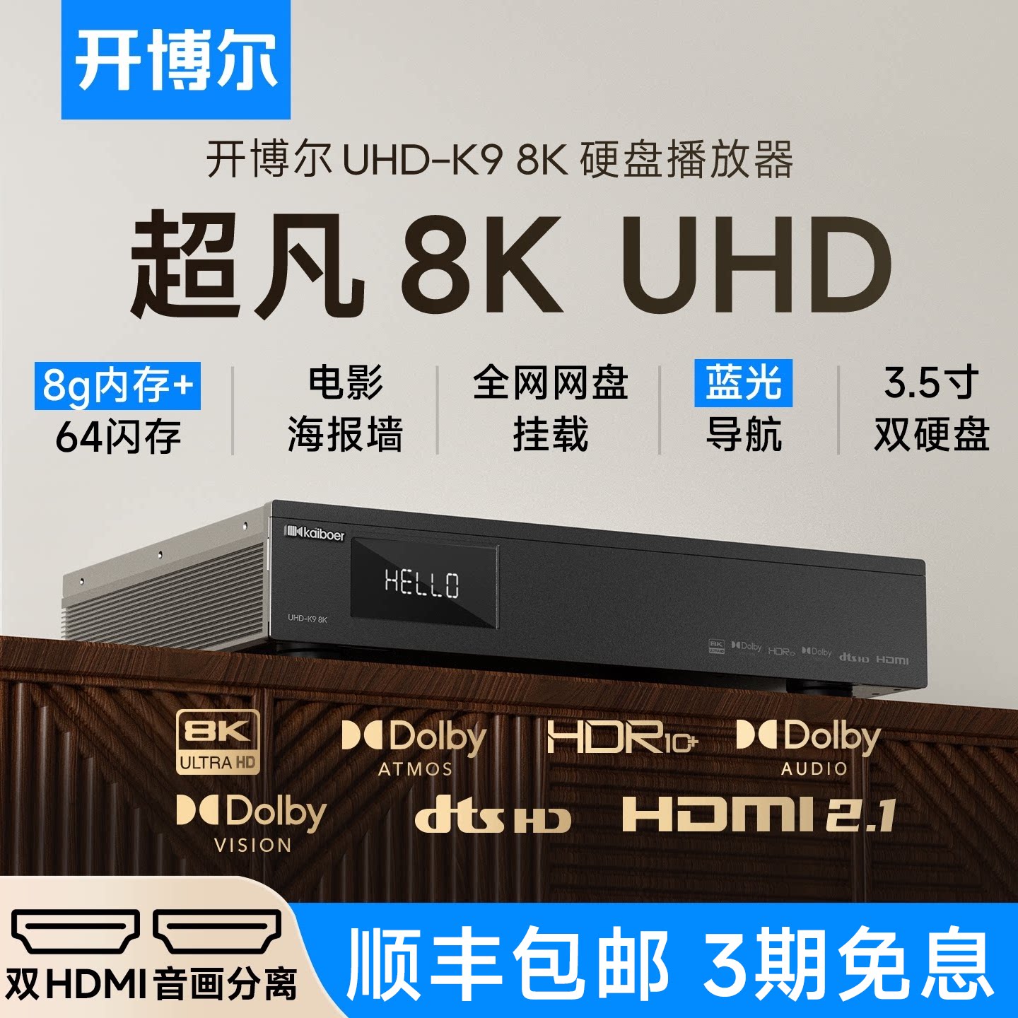 新款开博尔UHD-K9硬盘播放器8K蓝光超高清杜比视界播放机家庭影院