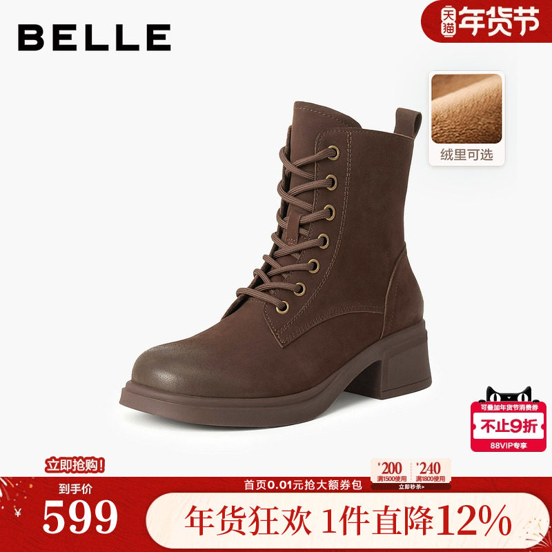 百丽女靴子厚底复古马丁靴冬新英伦风真皮短靴加绒时装靴D3F1DDD4