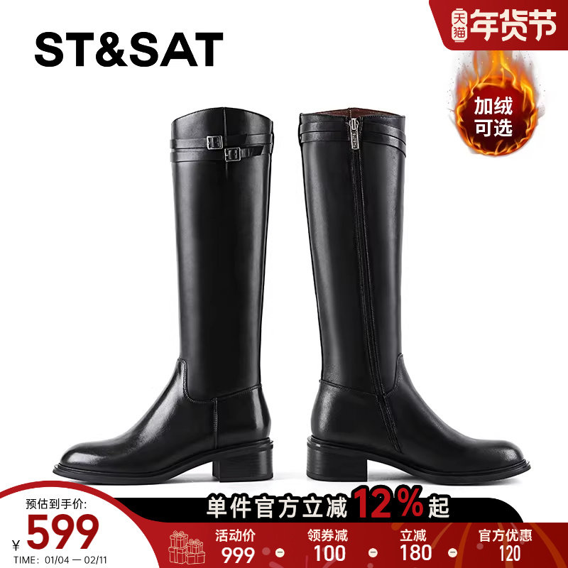 星期六加绒英伦长筒靴女2025秋冬粗跟圆头显瘦高不过膝全牛皮长靴