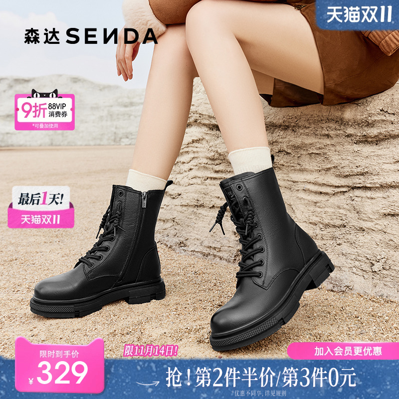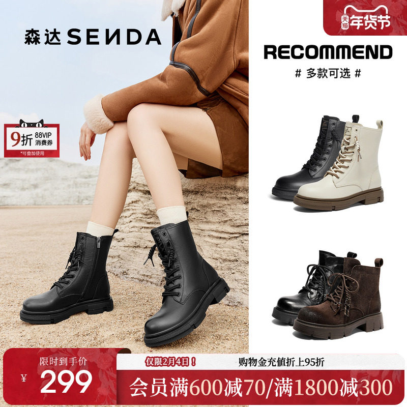 森达真皮马丁靴女冬款商场同款时尚英伦绒里厚底工装中筒靴XEC01