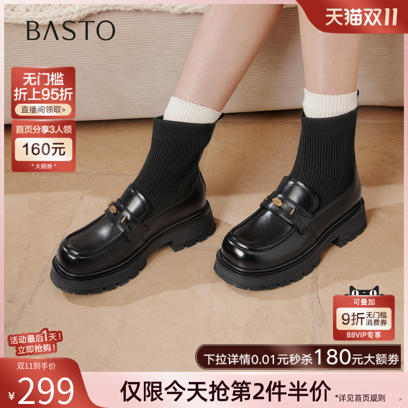 百思图2025冬新款英伦风乐福鞋袜靴弹力瘦瘦靴粗跟女短靴BP521DZ5