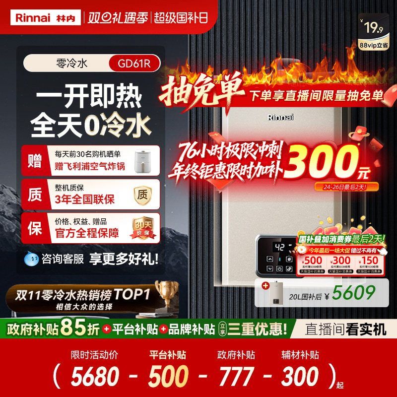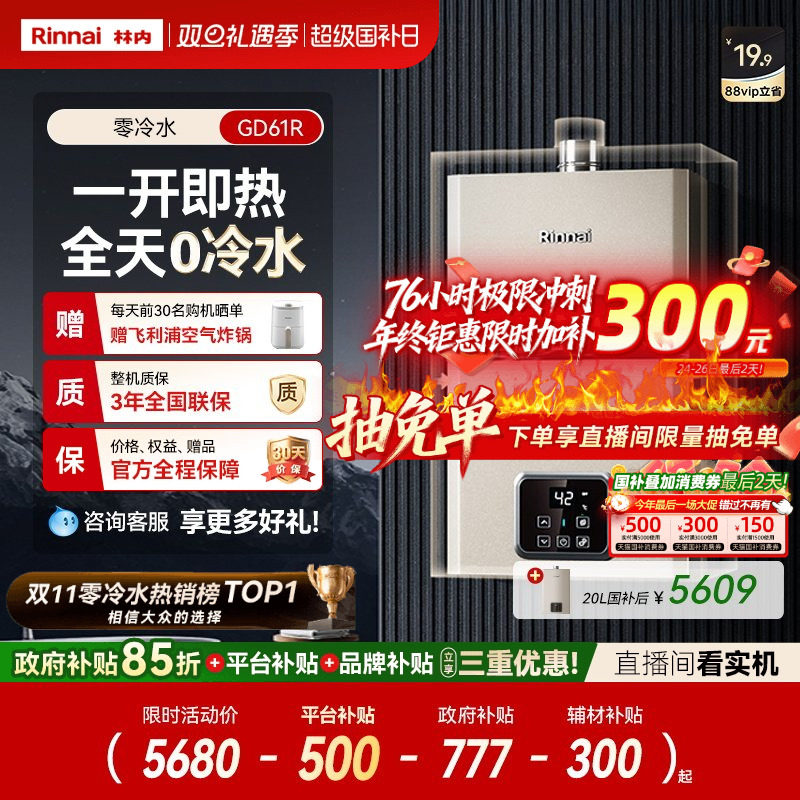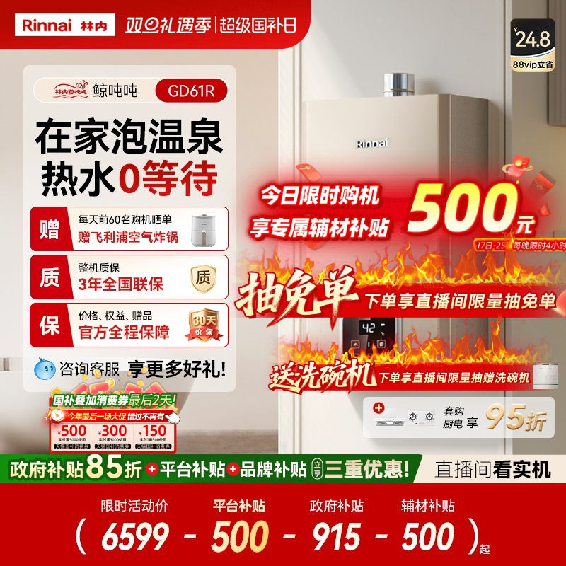 [鲸吨吨零冷水]林内燃气热水器天然气恒温即开即热20/24升GD61R