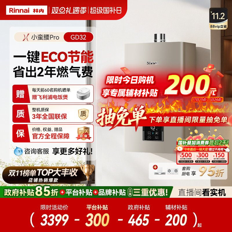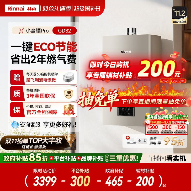 [小蛮腰Pro]林内燃气热水器家用恒温天然气节能洗澡13升16升GD32
