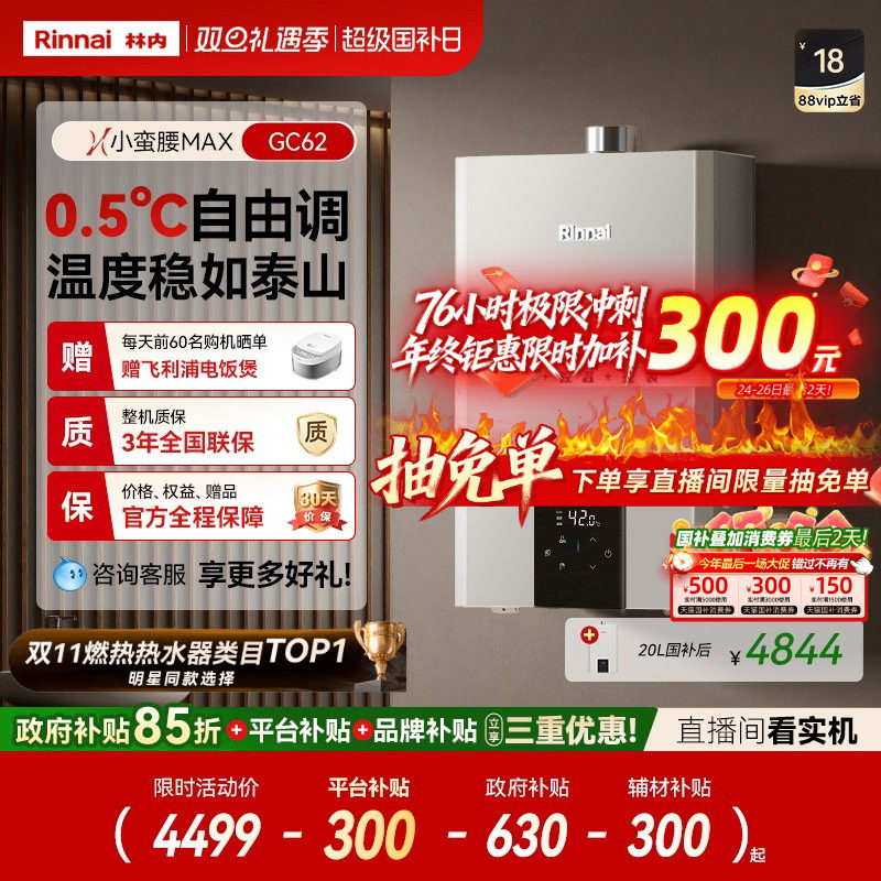 [小蛮腰MAX水伺服]林内燃气热水器GC62家用天然气13/16/20升恒温