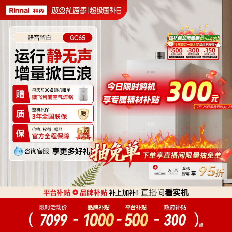 [新品水伺服]林内留白燃气热水器GC65一级静音天然气16升恒温速热