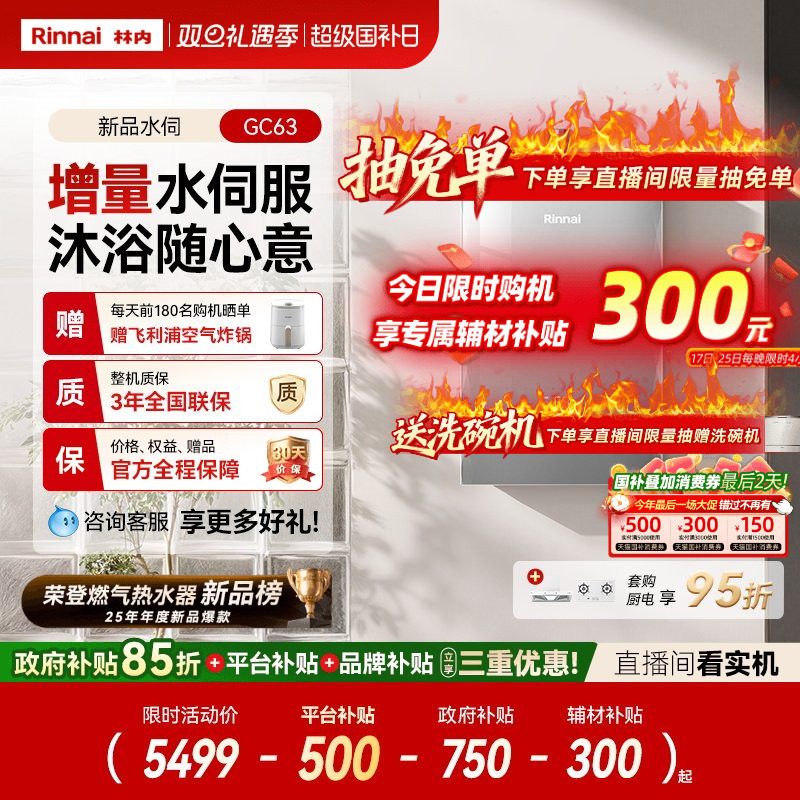 [新品水伺服]林内留白燃气热水器GC63家用天然气16/20升恒温速热