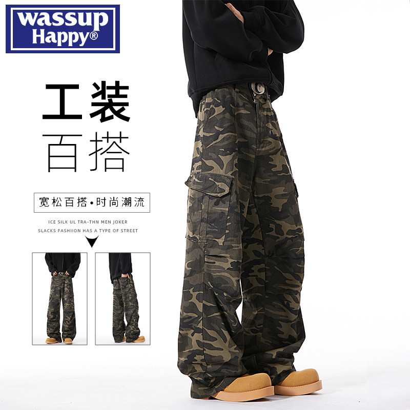 wassup happy美式复古迷彩休闲裤男款秋季高街阔腿伞兵工装裤子潮