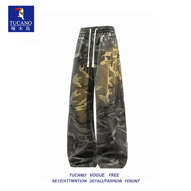 啄木鸟美式潮流褶皱迷彩休闲裤男士春秋季潮牌宽松直筒弯刀长裤子